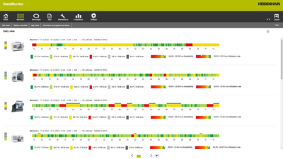 Orientado a la práctica, con vista general y de uso fácil: La pantalla de manejo del StateMonitor proporciona una vista general rápida del estado actual de la producción. Bajo los puntos de menú "Parque de máquinas", "Messenger", "Pedidos", "Mantenimiento" y "Evaluaciones" se encuentran todas las funciones necesarias para registrar, valorar y evaluar los datos de las máquinas de forma individualizada. Con ello se tiene siempre a la vista la disponibilidad y la tasa de utilización de las máquinas.